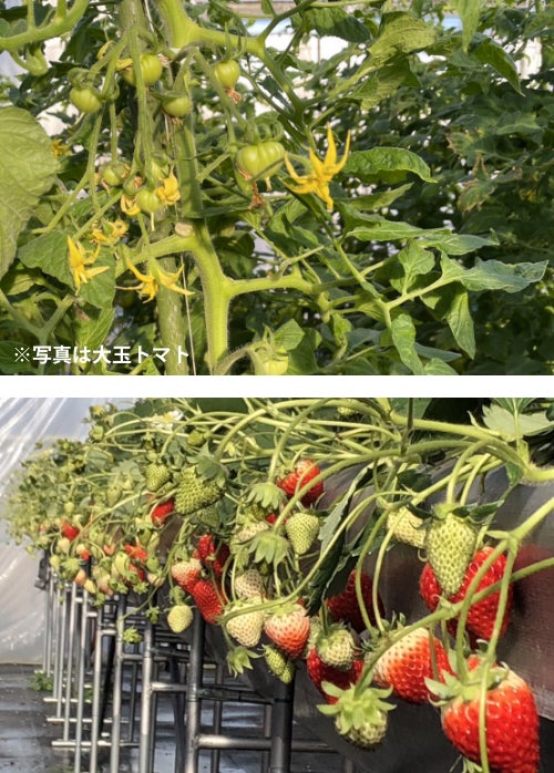 トマトやイチゴなど実をつける作物は、実を作るためにエネルギーを常に必要とするので、定期的に効率の良いエネルギーを与えることで花芽が増加したり、夏の暑さ冬の寒さに強い農作物を作ります。