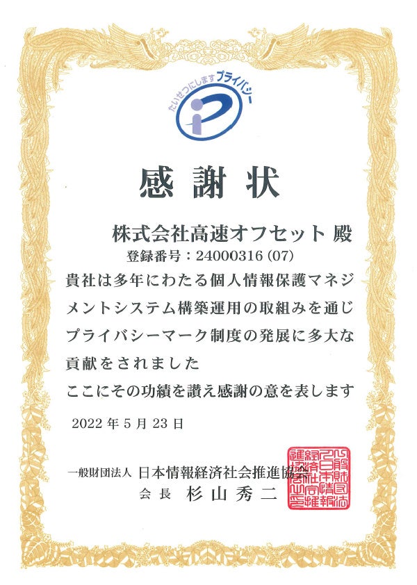 株式会社高速オフセットは、個人情報の取り扱いに関する「プライバシーマーク(Pマーク)制度」を運営している一般財団法人日本情報経済社会推進協会(JIPDEC、杉山秀二会長)から、感謝状の贈呈を受けました。