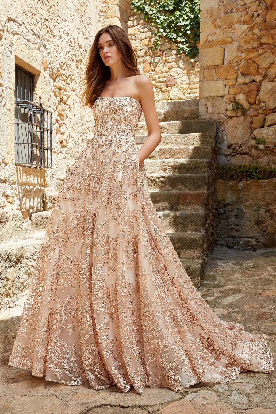 全身に施したリボン刺繍や、ゴールドとブラッシュを掛け合わせた人気のニュアンスカラーの色合いで、大人にも似合う絶妙な甘さも薫る運命の一着を纏うことができます。