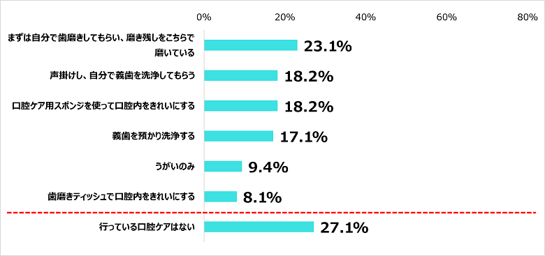 「行っている口腔ケアはない」を選択したのは27.1%だった。実施されている口腔ケアの中では「まずは自分で歯磨きしてもらい、磨き残しをこちらで磨いている(23.1%)」が最上位となった。