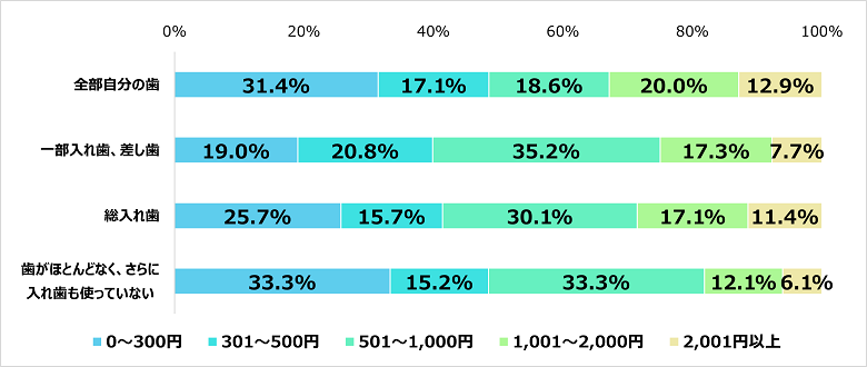 ケアにかける時間と同様に、被介護者の歯の状態によって差異があり、全部自分の歯の場合はケアにかける金額がやや低い傾向が見られた。