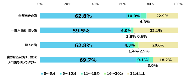 ケアにかける時間は、被介護者の歯の状態によって差異があり、一部入れ歯や差し歯の場合に比べ、全部自分の歯の場合はケアにかける時間が短い傾向が見られた。