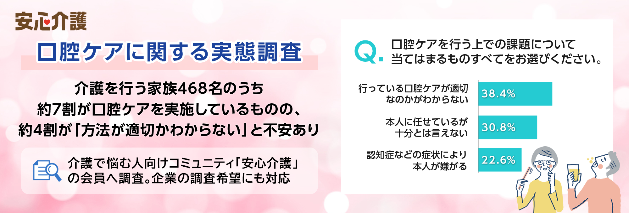 安心介護では、今後も口腔ケアに関する調査のみならず、会員に向けたさまざまな調査を行うことで、介護を行う家族の実態を広く伝えるとともに、介護に関わる企業への情報提供を行い、介護サービスや介護製品の発展に寄与できると考えています。また、介護関連企業からの調査希望にも対応しています。