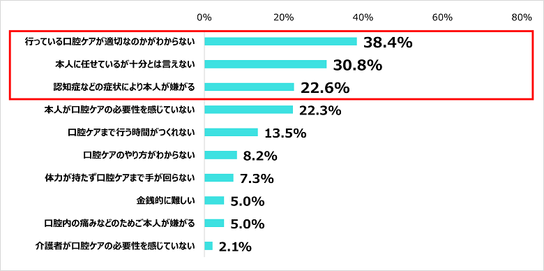 次いで、「本人に任せているが十分とは言えない(30.8%)」、「認知症などの症状により本人が嫌がる(22.6%)」が上位となった。実施内容への不安や被介護者からの拒否反応などが課題となっていることがわかった。