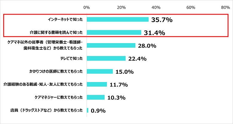 続いて、「ケアマネ以外の従事者(管理栄養士・看護師・歯科衛生士など)から教えてもらった(28.0%)」、「テレビで知った(22.4%)」という結果になった。介護を行う家族が、自発的に情報を収集している様子がうかがえた。