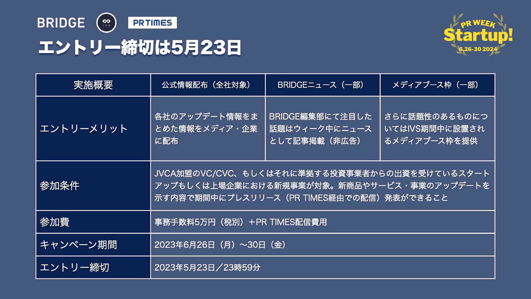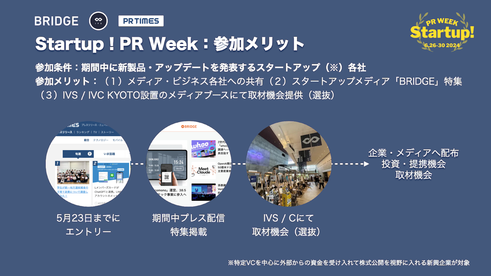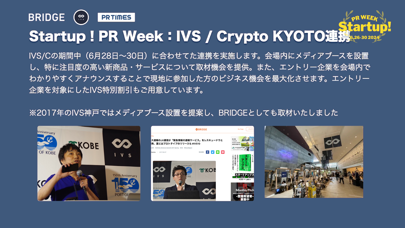 エントリー情報はスタートアップメディアBRIDGEにて特集掲載(※)いたします。また、期間中に開催されるIVS2023 KYOTO / IVS Crypto 2023 KYOTOに参加される企業の方についてはIVSと連携し、Startup!PR Week参加企業であることがわかる工夫をする予定です。投資家や事業会社、メディアなどキーマンが集まる場所で、新製品発表の話題を効果的にステークホルダーに届けるお手伝いをさせていただきます。