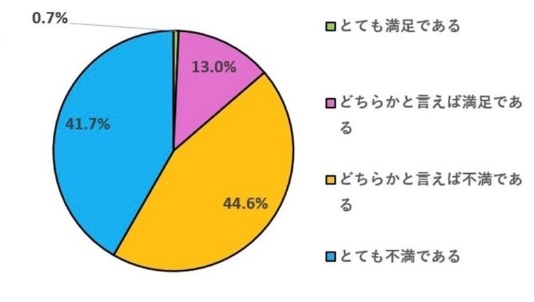 「どちらかといえば不満である」と回答された方が44.6%で「とても不満である」と回答された方が41.7%と不満だと思っている方が合計で86.3%もいらっしゃいます。とても満足している方は0.7%と完全に満足している方は非常に少ないということがわかります。