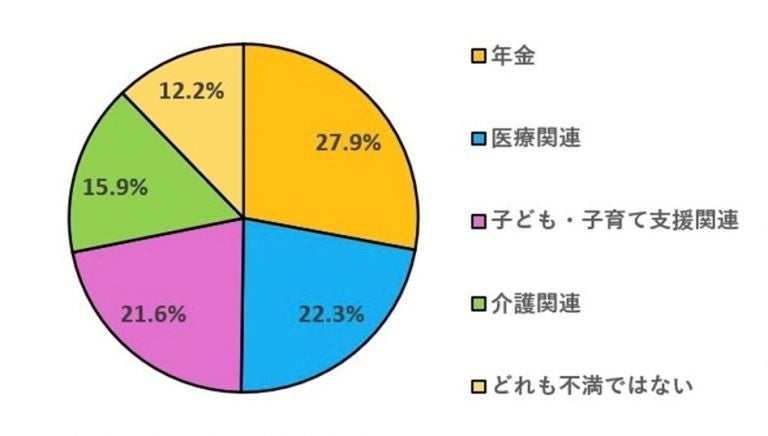 消費税の使われ方で不満があるかというアンケートについては、大きな差が付かず、全ての項目に満遍なく票が入っています。一番多いのが「年金」で27.9%。続いて「医療関連」が22.3%、「子ども・子育て支援関連」が21.6%となっています。これは、自分の年代に関わることに消費税が使われていないという不満の現れでしょうか。