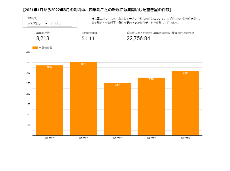 2023年第1四半期の成約面積は、36,379坪と前第1四半期を大きく下回る状況で、小規模の区画の成約が比較的多かったことが影響していると思われます。