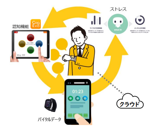 ミツフジが開発した体の状態が可視化できるスマートウォッチ“MITSUFUJI 03”から取得した心拍・ストレスなどのバイタルデータと、トータルブレインケアが開発した認知機能チェックとトレーニングが可能なアプリ“脳体力トレーナーCogEvo”、そしてemolが開発したAIチャットによる個人のメンタルヘルスセルフケアが可能な認知行動療法アプリ”emol”を組み合わせることにより、自分の健康状態を可視化し、日常の生活では気付きにくいストレスやメンタル不調による認知機能低下を早期に検知、また精神疾患の予防と認知行動療法の早期介入による社会不安等の軽減を実現させる仕組みを構築するため、神戸市民の協力を得て検証しました。