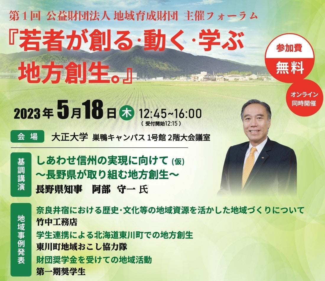 公益財団法人 地域育成財団は2021年4月に設立し、返済不要な給付型奨学金を地方で活躍を希望する次世代を担う大学生、大学院生、外国人留学生に対し給付している公益財団法人です。この度、設立3年目を迎え、地域創生に関する学業や研究に取り組む奨学生の学びの一助になればと『若者が創る・動く・学ぶ地方創生。フォーラム』を開催します。