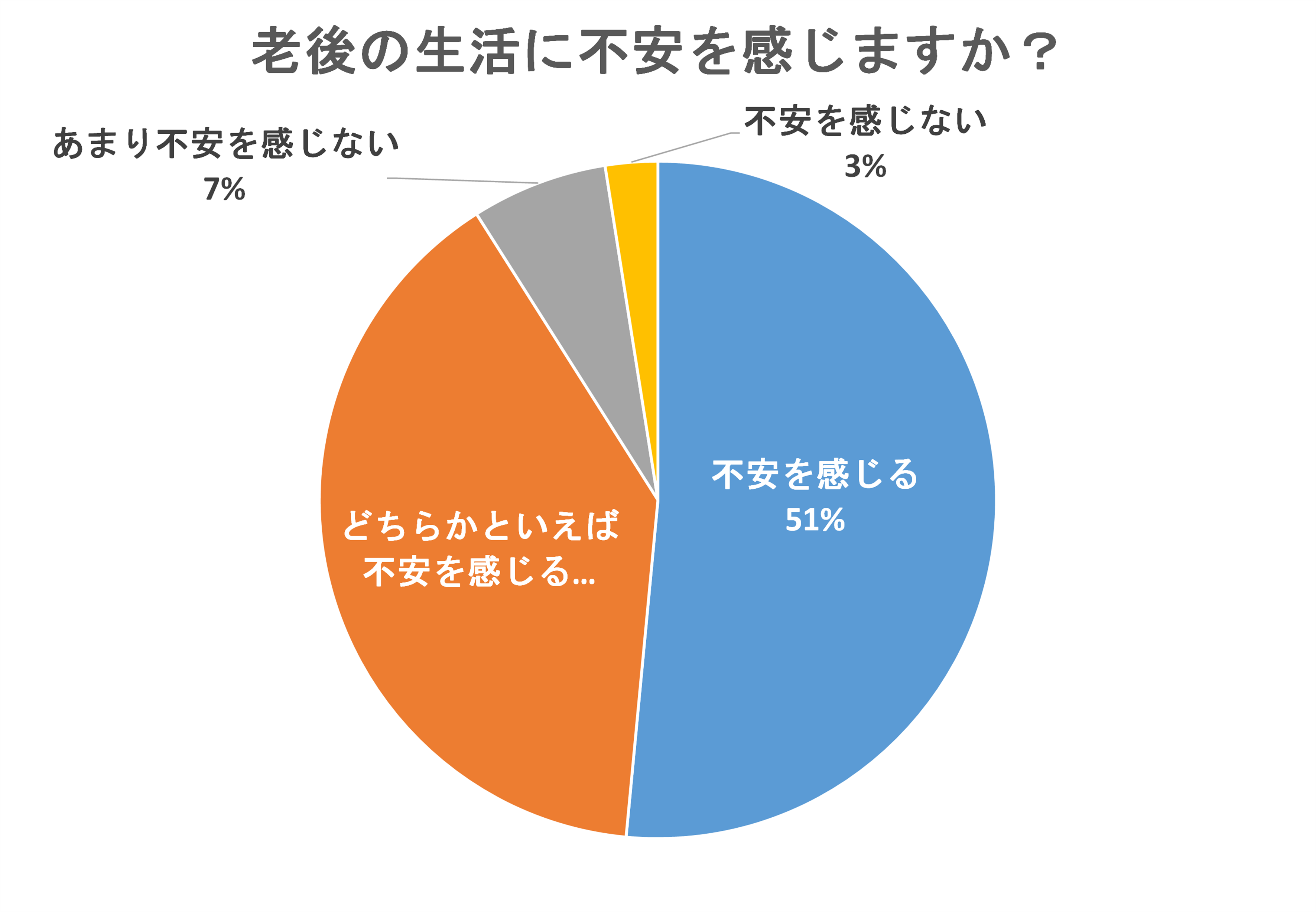 「老後の生活に不安を感じますか?」という質問では、51%が「不安を感じる」、39%が「どちらかといえば不安を感じる」と回答し、全体の90%の人が何らかの不安を感じている結果となりました。
