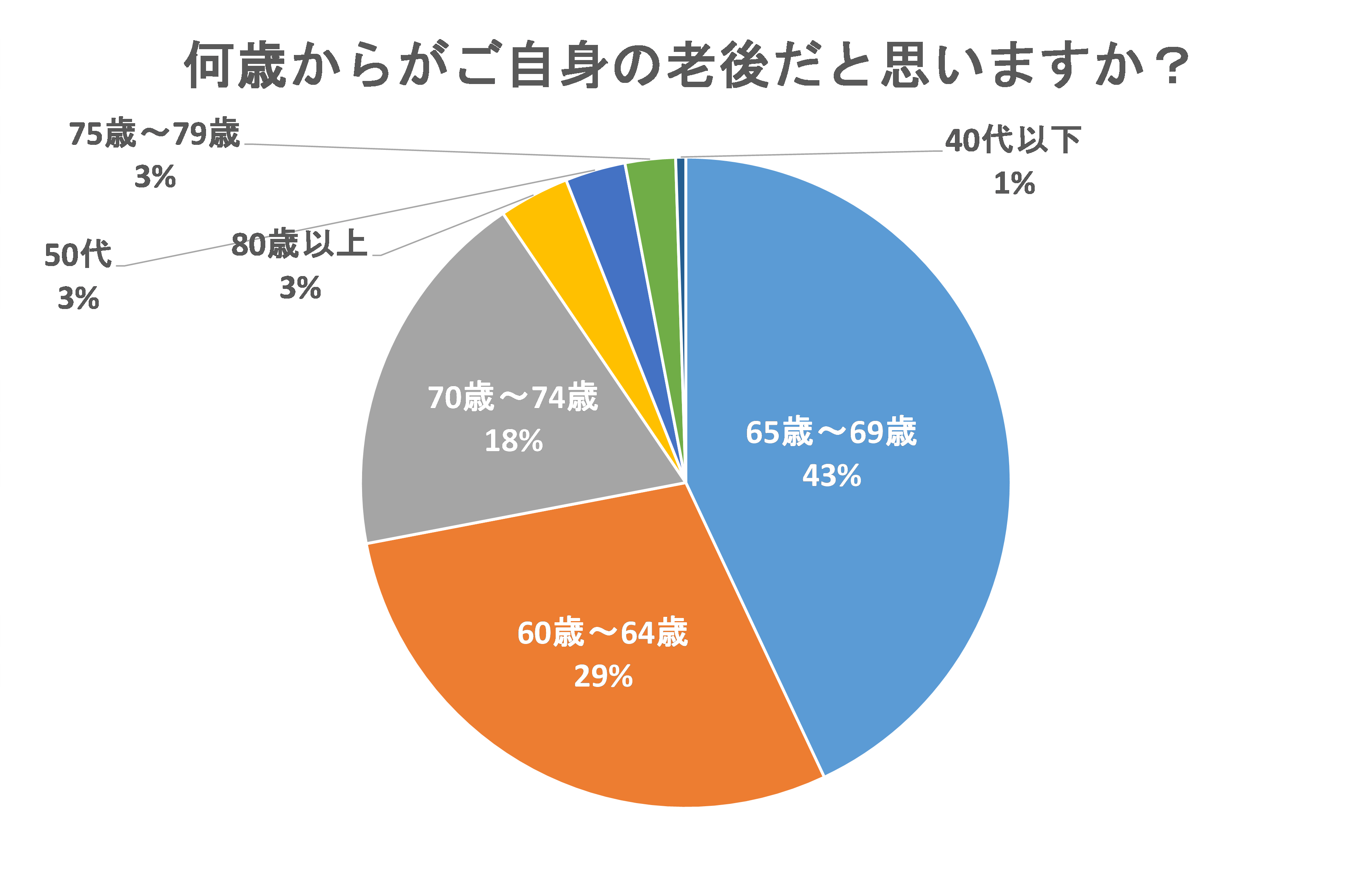 「何歳からがご自身の老後だと思いますか?」という質問では、43%が「65歳~69歳」と回答し、「60歳~64歳」が29%、「70歳~74歳」が18%と続く結果になりました。