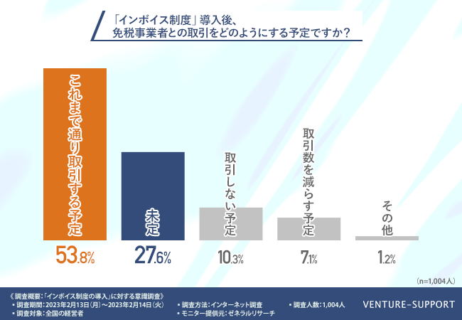 免税事業者との取引について「これまで通り取引する予定」が5割超。「未定」と回答した人は約3割という結果に