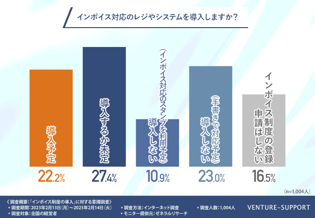 「インボイス対応のレジやシステムを導入しますか?」と質問したところ、「導入予定(22.2%)」「導入するか未定(27.4%)」「導入しない(インボイス対応のスタンプを利用予定)(10.9%)」「導入しない(手書きで対応予定)(23.0%)」「インボイス制度の登録申請はしない(16.5%)」という回答結果となった。
