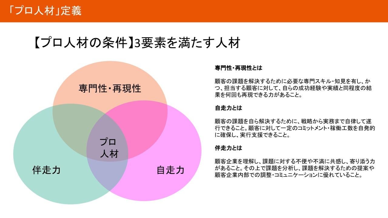 当社が定義するプロ人材とは「専門性・再現性」「伴走力」「自走力」の3要素を満たす存在です。この「プロ」という言葉について、企業側の認識は深いとは言えません。資料をお見せしながらプロ人材の定義をご説明すれば分かっていただける程度に留まっています。しかし、一度プロ人材を活用された企業は「なるほど、これがプロ人材か」と実感していただけるケースが多いので、やはり体感しないと心から納得はできないのだと思います。