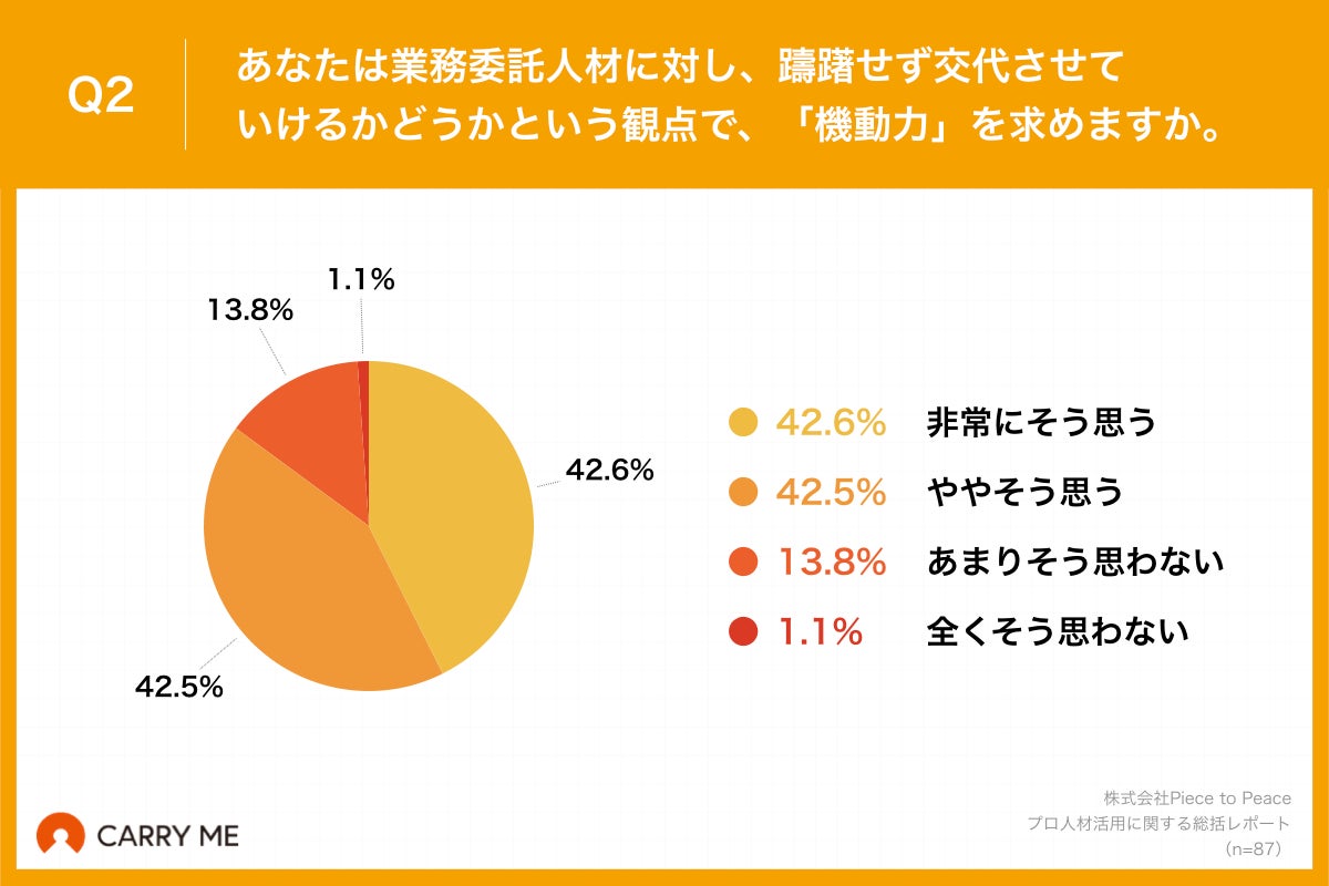 そこで、大手企業も新たなマーケットを求めてイノベーションや新規事業開発に力を入れていますが、新規事業の場合は特に、求められている分野や段階によって必要な人材が流動的になります。その時々に必要な施策に合わせて、躊躇せず人材を交代させていけるかどうかが成功の鍵を握っています。既存の事業においても、機動力は必要です。実際、当社が経営者に対して行った調査(※)によると、業務委託活用に関して85.1%が機動力を重視しつつも人材の交代に躊躇した経験が1度以上あるとの回答は66.3%に及びます。業務委託人材の交代に躊躇せず事業を推し進めることが大切であり、そのためにも成果にコミットするプロ人材の活用が求められます。