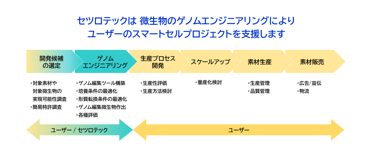 今回、セツロテックは、日油との協創により、独自のゲノム編集因子ST8を用いた微生物のゲノムエンジニアリングによる効率的な有用素材生産系の構築を目指します。ゲノム編集技術の発展により、「ゲノム編集育種」と呼ばれる、より効率的かつ簡便な生物の改良手法が開発され、社会実装を進める動きが世界中で加速しています。ゲノム編集技術は、技術自体の汎用性が高く、微生物を含む幅広い生物種への応用が可能であり、本技術の活用によって、有用素材の開発対象を大きく広げることが可能です。ゲノム編集技術を活用することで、培養細胞の遺伝子に多数の改変を加え、物質・素材の生産のために特定の機能を高めた細胞(スマートセル)を作製することができます。既に、セツロテックは、酵母などの微生物からブタなどの哺乳類に至るまで、幅広い生物種でのゲノム編集実績をもち、特に、産業用酵母(倍数体)における高効率なゲノム編集技術を確立しています。豊かで持続可能な社会の実現のための新たな価値を提供することを目指す日油との協創により、健康食品向け有用素材の高機能化や生産効率化、高度利用を目指していきます。