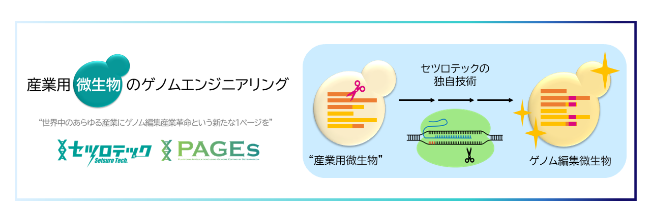 セツロテックは、徳島大学で培った技術とノウハウを基に2017年に創業した、徳島大学発ベンチャー企業です。徳島大学の竹本龍也(代表取締役会長CTO)らは、2015 年に「ゲノム編集マウスを簡便にかつ高効率に作製できる手法」を開発しました(特許6980218号)。また、徳島大学の沢津橋俊(取締役CSO)は、培養細胞で高効率ゲノム編集を実現するVIKING法を開発しました(特許6956995号)。さらに、独自の新規ゲノム編集因子ST8(特許7113415号)を開発し、医療分野のほか、農業や畜産分野において品種改良を高速化する研究開発を進めています。セツロテックは、これらの独自技術を活用し、アカデミア・企業の研究者向けのゲノム編集受託サービスを展開するほか、Cas9代替因子を活用したゲノム編集生物を広く産業界に提供し、ゲノム編集産業を開拓することを目指すPAGEs(Platform App(lication) using Genome Editing by Setsurotech)事業を展開しています。セツロテックのPAGEsでは、対象素材や対象生物の実現可能性調査や簡易特許調査などから、ゲノム編集生物作出まで、事業開発を幅広くサポートすることが可能です。セツロテックは、「ゲノム編集産業革命で、人と地球をもっと豊かに」というビジョンを掲げ、ゲノム編集技術の社会実装に貢献して参ります。