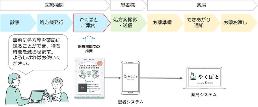「やくばと」は、薬局での待ち時間削減やかかりつけ化を推進する、処方箋画像事前送信による医療機関起点の薬局予約サービスです。導入医療機関内で患者さまに「やくばと」の案内がされ、患者さまはご自身のスマートフォンを用いて薬局を選択し処方箋画像事前送信を行います。スマートフォンを用いることで、場所を取らない他、SMSによる出来上がり通知を受け取ることができ、従来から設置されている処方箋FAXコーナーが果たしていた機能を、より簡便に使いやすい形で提供します。