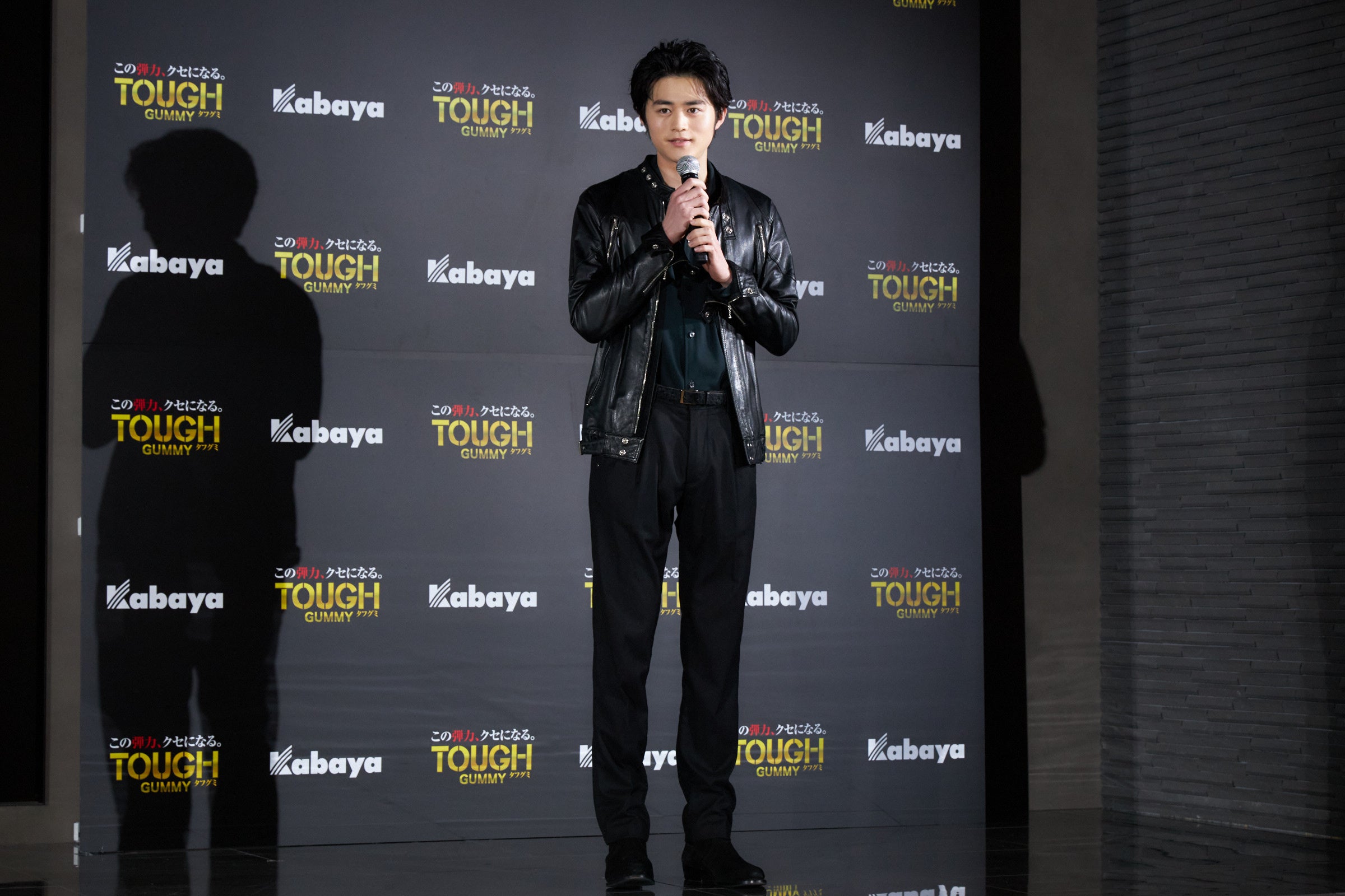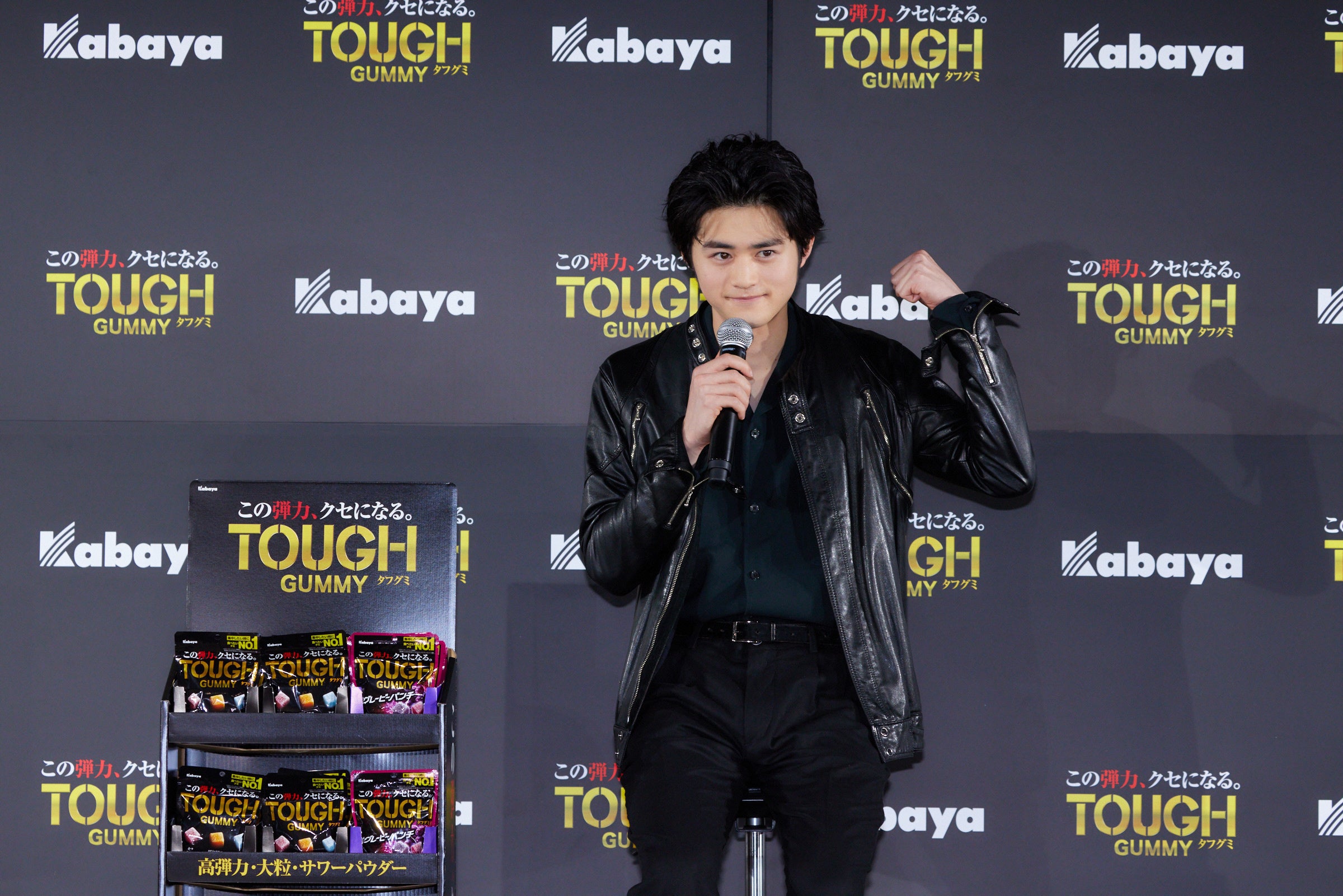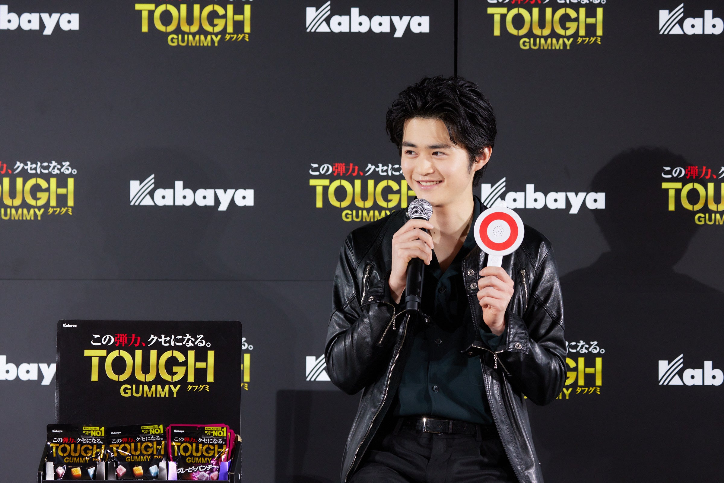 「タフグミ」は、クセになる高弾力食感とサワーパウダーが特徴の大粒グミです。2023年5月9日(火)から公開される新CMでは、その「タフグミ」の特徴を、いつもの鈴鹿央士さんの印象とは異なる「タフで力強い」表情で表現しています。鈴鹿さんは、今回の「タフグミ」新CM発表会にもCM出演時のように、いつもとは印象の異なるヘアスタイルと衣装で登場し、会場を魅了しました。また、発表会の最後には、カバヤ食品創業の地であり、鈴鹿さんの故郷である岡山の、岡山弁で「タフグミ」の魅力をアピールするなど、いつもの笑顔やお茶目な一面も覗かせました。