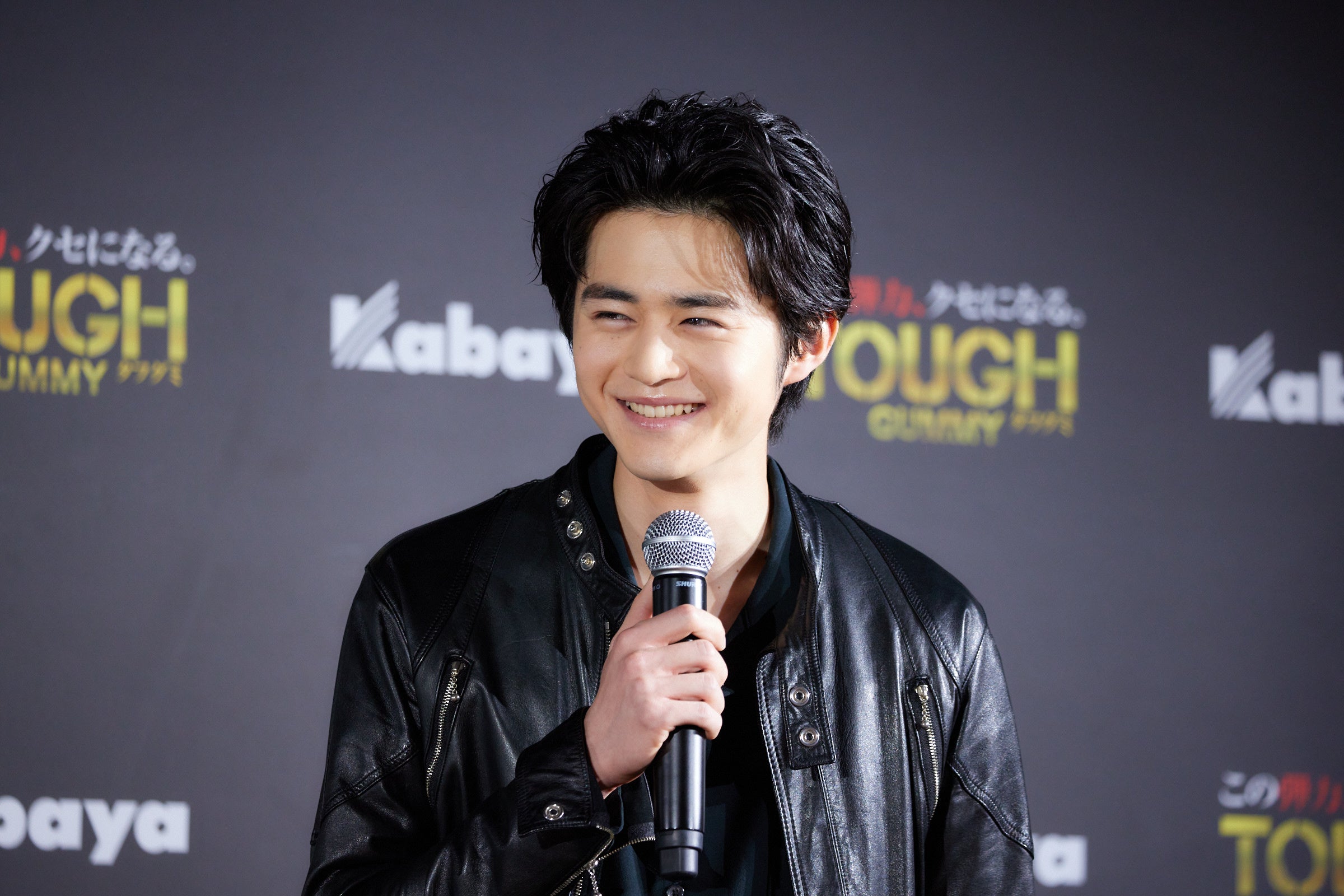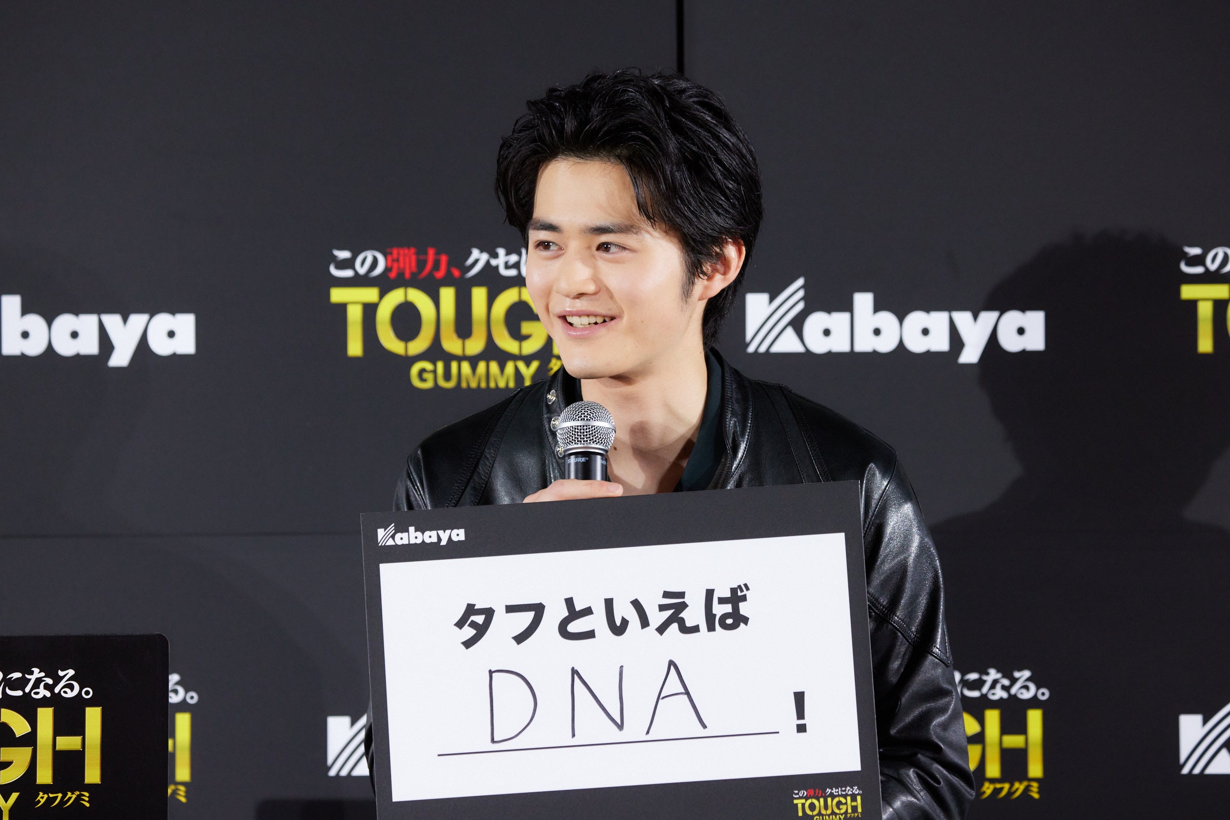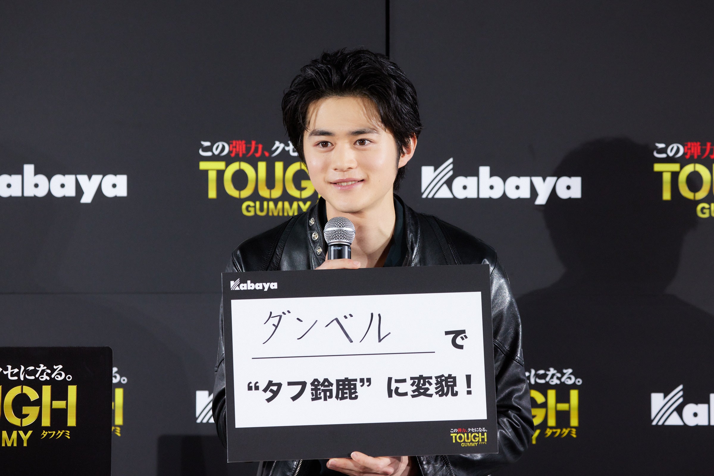 「タフグミ」は、クセになる高弾力食感とサワーパウダーが特徴の大粒グミです。2023年5月9日(火)から公開される新CMでは、その「タフグミ」の特徴を、いつもの鈴鹿央士さんの印象とは異なる「タフで力強い」表情で表現しています。鈴鹿さんは、今回の「タフグミ」新CM発表会にもCM出演時のように、いつもとは印象の異なるヘアスタイルと衣装で登場し、会場を魅了しました。また、発表会の最後には、カバヤ食品創業の地であり、鈴鹿さんの故郷である岡山の、岡山弁で「タフグミ」の魅力をアピールするなど、いつもの笑顔やお茶目な一面も覗かせました。