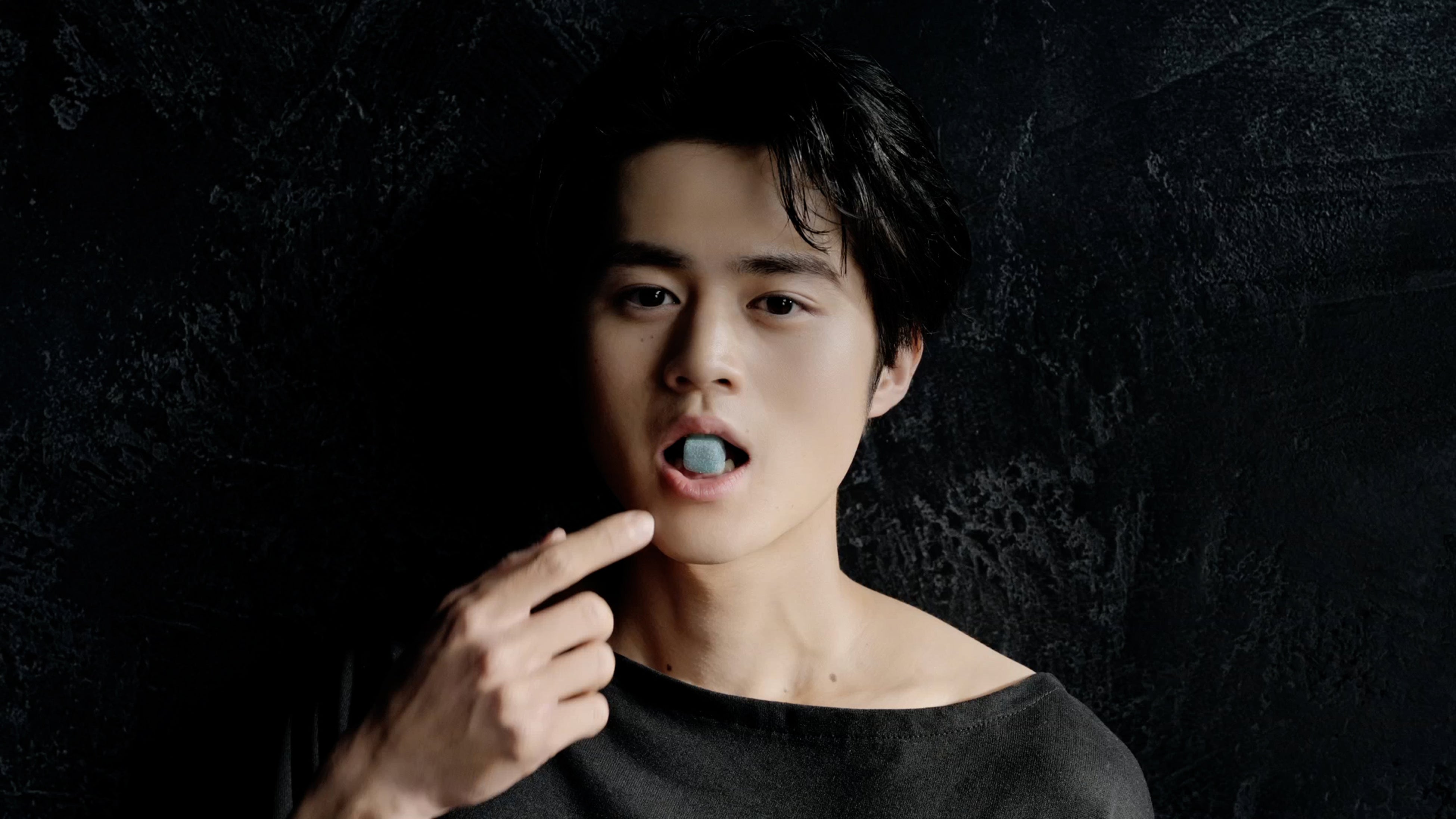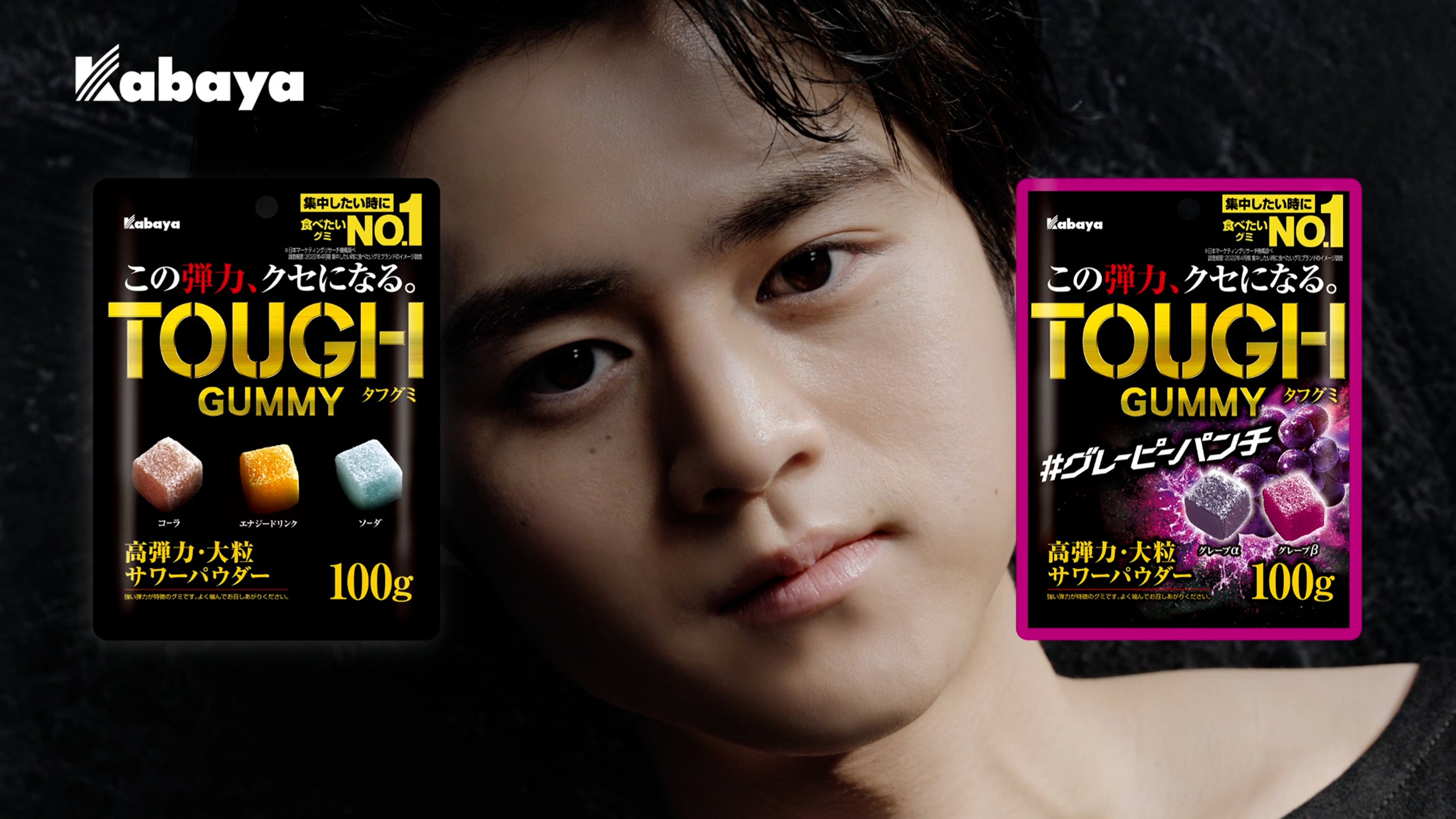 新CMは、前髪を大胆にかき上げ、いつもとは異なる印象の鈴鹿央士さんの顔を、アップで映したシーンからはじまります。最初は爽やかで柔和な表情の鈴鹿さんですが、タフグミを味わい、ゆっくりと噛みしめると表情が一変!強烈な目力とともに、「タフで力強い」オーラがあふれ出します。タフグミをしっかりと味わった鈴鹿さんは、集中力がみなぎった様子で立ち去り、CMを締めくくります。いつもの笑顔を封印し、タフで力強い鈴鹿さんに変貌する、鈴鹿さんの細やかな表情変化に注目です。
