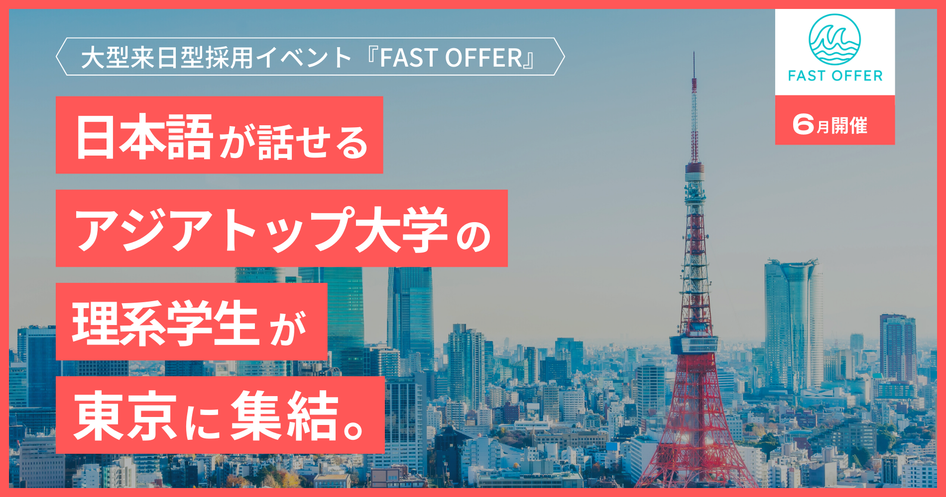 海外の主要大学と提携した大学内での日本語学習などを通じ日本への就職のきっかけを学生に提供する株式会社ASIA to JAPAN(代表:三瓶 雅人 本社:東京都台東区 以下:ASIA to JAPAN)は、 海外の学生と日本の企業をオフラインでマッチングを行う「FAST OFFER」を、2023年6月27日(火)〜29日(木)の3日間で実施いたします。今年3月に3年ぶりに来日型の面接イベントを実施し、多くの反響をいただきました。今回は、出国制限が緩和された中国の学生も来日対象となります。アジアトップクラスの学生と面接できる機会の活用をぜひ、ご活用ください。