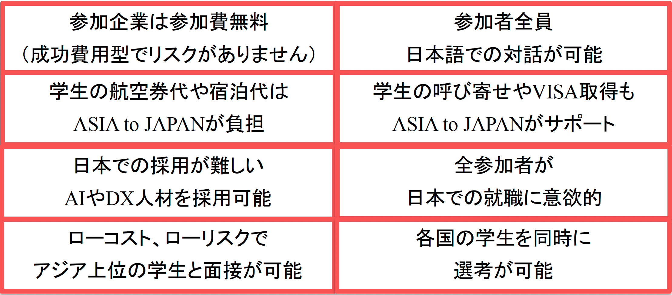 アジア各国、各地域におけるトップクラスの大学から学生を日本へ招待し、日本の企業とマッチング(採用面接)を行う「来日対面型の面接イベント」です。海外の学生を採用する場合、通常であれば現地に赴く必要があります。しかし、言葉の壁、移動の負担、対応できる社内のリソース確保など、海外での採用活動を行うには多くのハードルがあります。そのハードルを低くし、気軽に人材を見つけ出す場として本イベントを実施いたします。