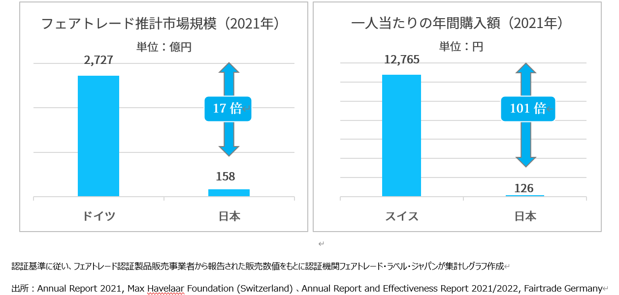 フェアトレード・インターナショナルの本部があるドイツと日本の市場規模を比較すると、ドイツは2,727億円と、日本の約17倍。一人当たりの年間購入額が最も多いスイスと年間購入額を比較すると、スイスは12,765円と日本の約101倍という結果となりました(※)。欧州諸国で規模が大きい背景には、消費者の環境・社会課題に対する意識の高さや、フェアトレードの認知の高さを受けて、企業が積極的にフェアトレードを取り入れる傾向があります。欧州と日本の差はまだ大きいものの、前年と比較するとその差は縮んできているため、今後の日本市場の躍進が期待されます。(前年はドイツと日本の市場規模の差は約18倍、スイスと日本の一人当たり年間購入額の差は約108倍でした)