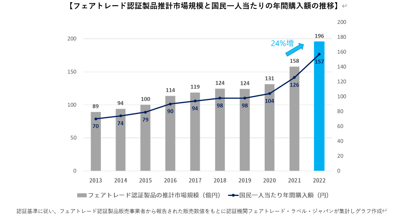 2022年のフェアトレード認証製品の推計市場規模は195.6億円となりました。2021年の157.8億円と比較をすると24%増という過去10年で最大の伸び率となり、さらに市場規模の拡大幅で見ると前年比38億円と推計史上最大の拡大を記録した1年となりました。