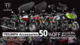 期間中、トライアンフ正規販売店にて新車ご購入の注文時に、ご購入車両に適用の車体アクセサリー類を一緒にオーダーすると、アクセサリー類の通常希望小売価格から50%オフで新車にアクセサリーパーツを取り付けることが可能となります。