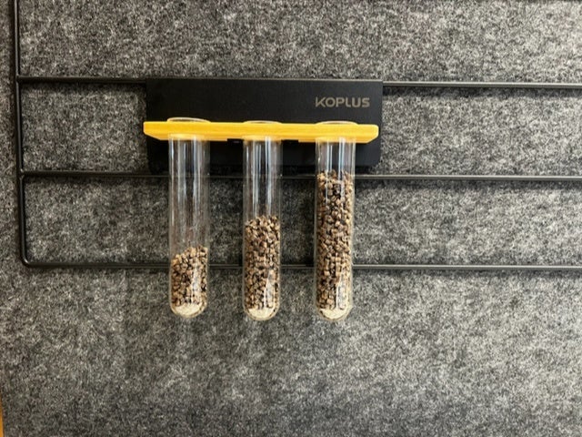 素材の製造では、井上企画で販売・加工している家具材の広葉樹(ウォールナット、ホワイトオーク)を使用します。その廃材を自社で粉砕し、ポリプロピレンと混ぜて、樹種別の木粉ペレット(WPC)製造しています。