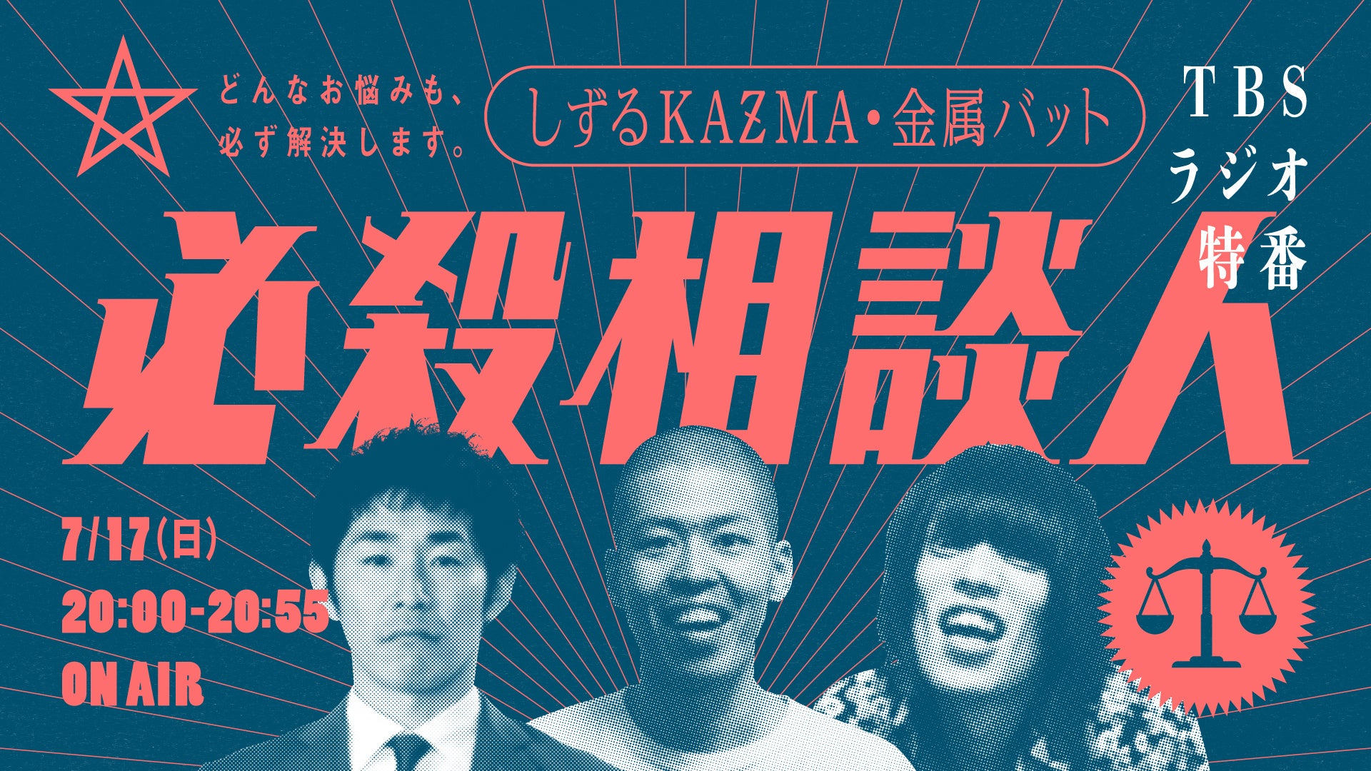 2022年7月17日(日)20時、”しずる・KAƵMA”と”金属バット”による特別番組「必殺相談人」を放送します!この番組は、一般相談者が抱える真剣なお悩みを「必殺相談人」たちが解決する、”絶対解決型”の相談番組です。どのような相談がきて、”しずる・KAƵMA”と”金属バット”がどのように解決するのか…この番組がどのような内容になるかはまったくナゾですが、この2組、きっと見事にどんな相談も解決してくれるでしょう。