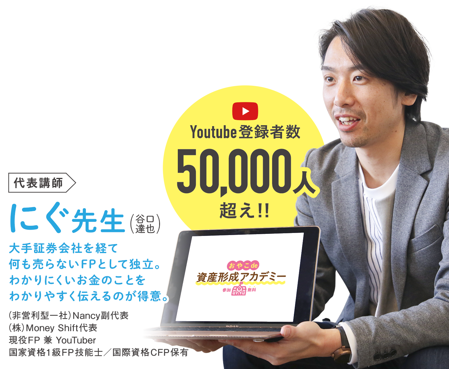 (非営利型)一般社団法人Nancy副会長。株式会社マネーシフト創業者。野村証券、岡三証券で8年勤めた後に独立系FPとして独立。1級ファイナンシャル・プランニング技能士(国家資格)に合格。CFP保有(世界が認めるプロのFPであり、FPの頂点と言われる国際資格)。2020年にYouTubeでチャンネルを開設し、資産運用全般を初心者向けにわかりやすく配信。現在は登録者が56,000名に到達。