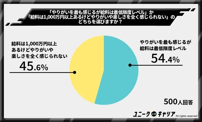 仕事にやりがいを感じている500人を対象に、「やりがいを最も感じるが給料は最低限度レベル」か「給料は1,000万円以上あるけどやりがいや楽しさを全く感じられない」どちらを選ぶかという質問をしたところ、54.4%が「やりがいを最も感じるが給料は最低限度レベル」を選ぶと回答した。