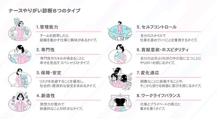・内容:看護師として働く上で大切にしたい価値観を、全8タイプから診断。その中で自身が最も大切にしている価値観を判定し解説するほか、判定されたタイプ別に、自身の強みや働き方の適性と傾向についてキャリアパートナーからのアドバイスを読むことも可能。診断結果を日々の業務に活かすことや、今後のキャリアプランについて考える際に自己分析の手段として活用できることが特長。