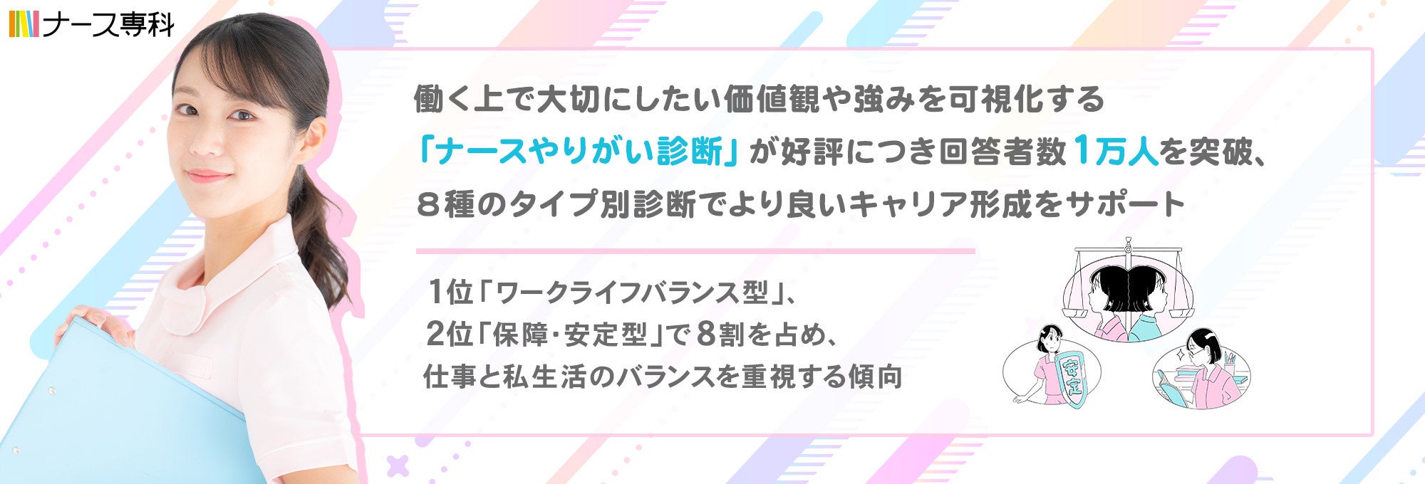 ナース専科では、2022年9月から、看護師がより充実感を持って働けることや自身の仕事への価値観を可視化することでより良いキャリア形成の一助となることを目的に、ナースやりがい診断の提供を開始しました。ナースやりがい診断は、アメリカの心理学者エドガー・H・シャインが「人がキャリアを形成する際の根源になるもの」として提唱したキャリアアンカー理論を参考に、性格タイプに関する研究に取り組むパーソナリティ研究家監修のもと、看護師のキャリアを支援し続けてきた当社のキャリアパートナーとナース専科コミュニティ事業部が共同で開発したコンテンツです。