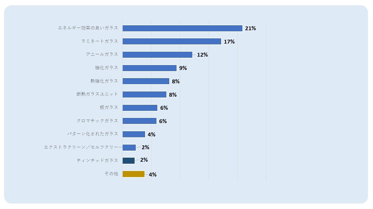 - それに加えて、安全ガラスの需要も高い。ガラスファサードは、ボルト締めグレージング、カーテンウォール、スパイダーグレージングなどがあり、多くの建築家が製造業の家屋に好んで使用しています。リサイクル可能な性質、耐久性、騒音防止、低メンテナンス、耐腐食性、音響的快適性などが、需要増加の原動力となっています。