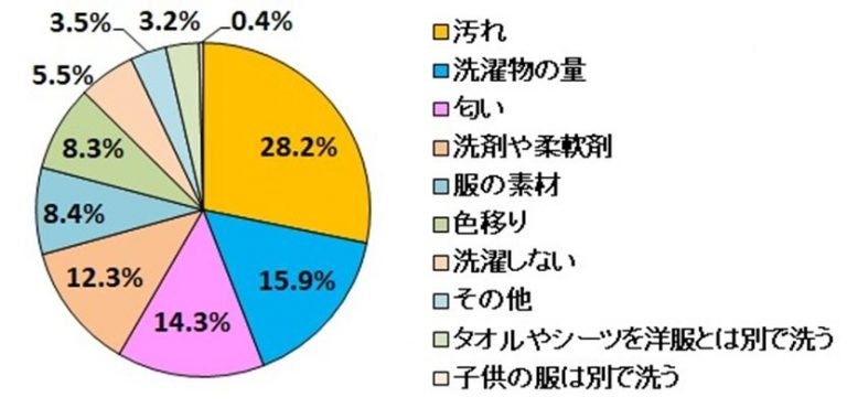 洗濯で最も重要視することは「汚れ」がトップで、28.2%。次いで「量」(15.9%)、「匂い」(14.3%)、「洗剤や柔軟剤」(12.3%)が上位を占めました。