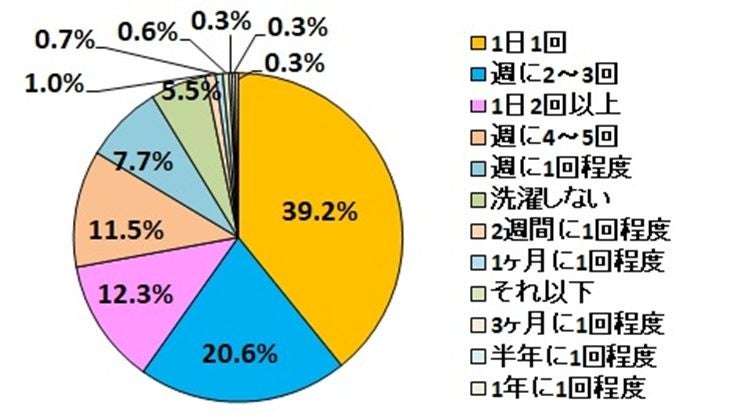 洗濯する頻度は「1日1回」が最も多くて、ほぼ4割。3位の「1日に2回以上」(12.3%)と合わせると、毎日洗濯する人が5割を超えています。
