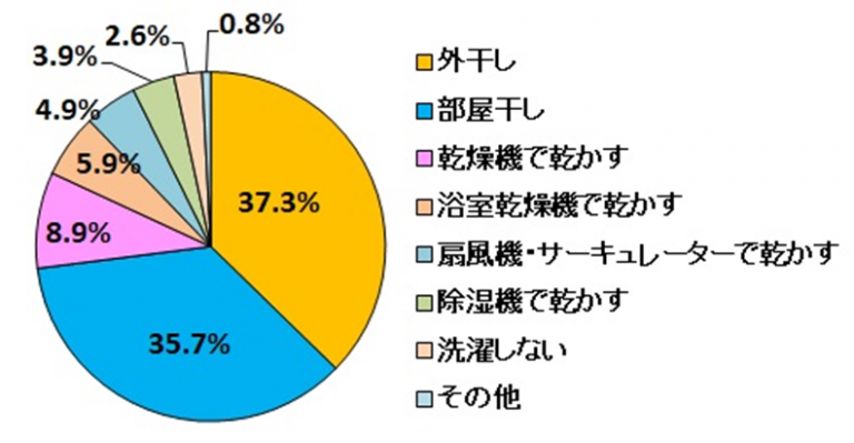 洗濯物を乾かす方法は複数回答可で質問しました。「外干し」(回答数37.3%、回答者数は668人)と「部屋干し」(35.7%、638人)を合わせて回答数の7割を超えています。