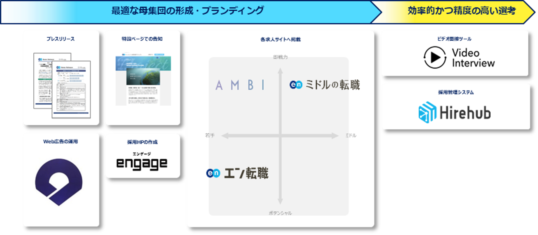 プレスリリースや特設ページ、『engage』を用いた採用HPの作成、Web広告での告知に加え、各求人サイトでの集客支援を行ないます。『エン転職』『AMBI』『ミドルの転職』とターゲットの異なる4つの求人サイトを活用することで、ターゲットへ網羅的に求人を届けます。ビデオ面接ツール『VideoInterview』、採用管理システム『Hirehub』の提供により、選考フローを支援。求職者と同社の適切なマッチングを実施します。
