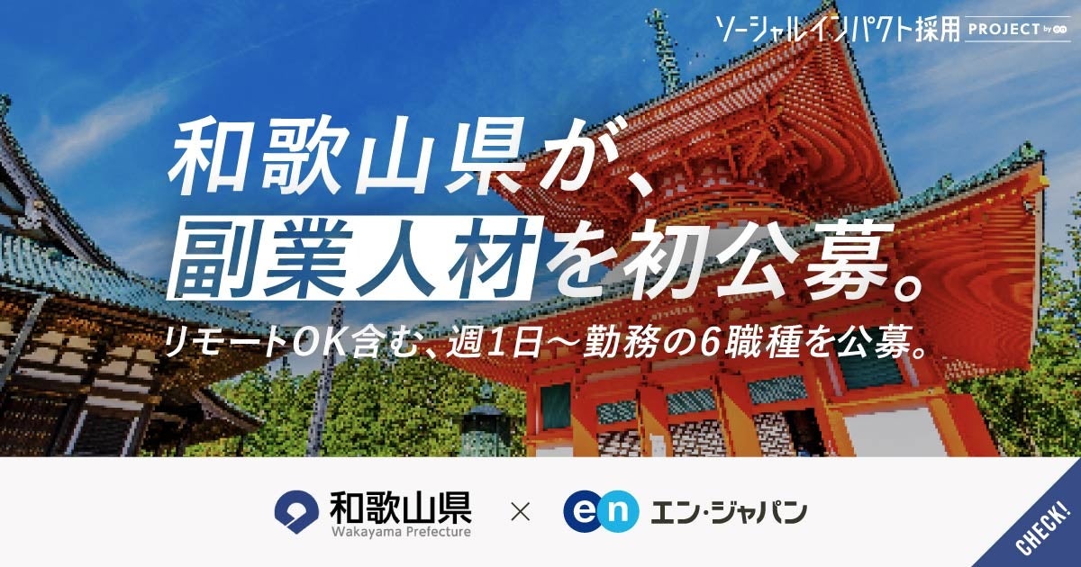 今回募集するのは6職種。週1日~勤務(一部職種はリモート可)の副業募集で、いずれも和歌山県初のポジションとなります。「外国人旅行者誘客推進アドバイザー」、「和歌山県産品販路開拓コーディネーター」をはじめ、「アントレプレナーシップ教育推進アドバイザー」など、庁内にない専門人材を募り、様々な重点テーマへの取り組みを強化する狙いです。好機を活かし、大きな飛躍を遂げようとする和歌山県で、ともに挑戦していってくださるプロ人材の方々からのご応募をお待ちしています。