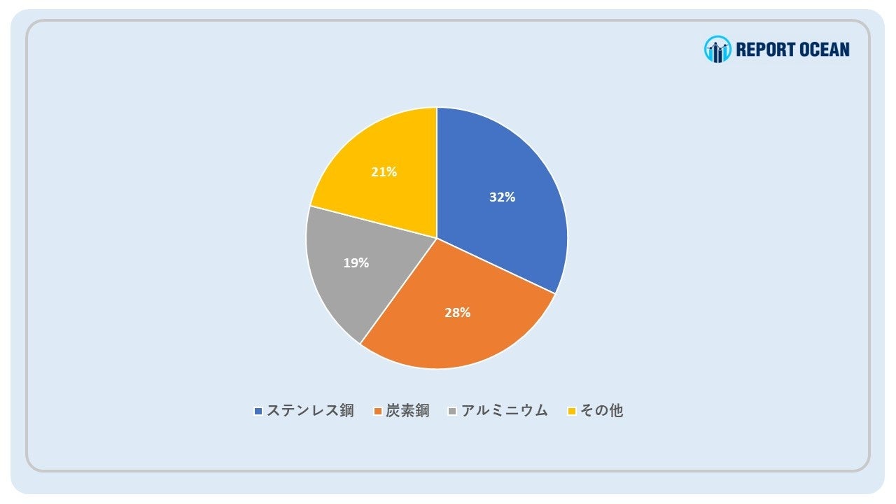 素材別では、ステンレス、炭素鋼、アルミニウム、その他に分けられます。そして2023年では、ステンレスセグメントが市場をリードしています