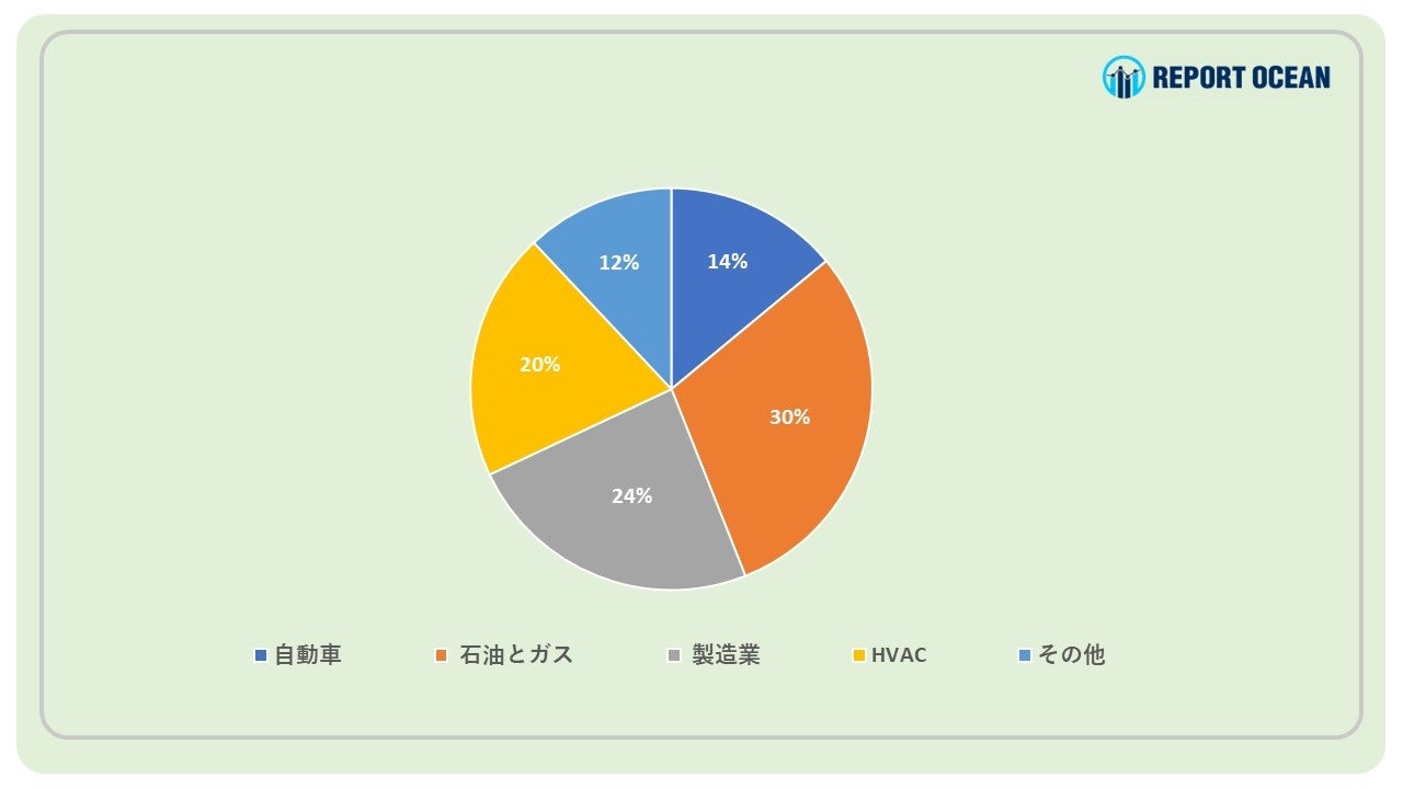 業種別では、自動車、石油・ガス、製造、HVAC、その他に分類されます。業種別では、2023年に石油・ガス分野が収益の面で市場をリードし、予測期間に最も高いCAGRを記録すると予測されるのはその他の分野です。