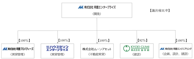 創業55年、物造りにこだわった信頼と実績の東証上場デベロッパーとして、東京23区を中心に100棟を超える“新築1棟投資用賃貸住宅”を供給している株式会社明豊エンタープライズ(東京都目黒区:代表取締役 矢吹 満)を親会社とし、賃貸管理会社の株式会社明豊プロパティーズ(東京都目黒区:代表取締役 太田 孝)、株式会社ハウスセゾンエンタープライズ(京都府京都市:代表取締役 奥山 秀昭)、物件保有会社の株式会社ムーンアセット(京都府京都市:代表取締役 杉本 圭司)、建設会社の株式会社明豊エンジニアリング(東京都目黒区:代表取締役 太田 孝)、株式会社協栄組(東京都世田谷区:代表取締役 五十嵐 一洋)で構成されております。