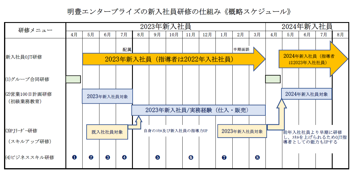 明豊エンタープライズでは、貴重な若手の人的資源の生産性を1年で向上させることを狙いとし、新卒入社社員研修をグループ合同研修、配属予定部門の初級業務教育(実務の入口に立つための「100日計画」)、入社半年後のスキルアップ(PJリーダー)研修、ビジネススキル研修の4メニューに分け、1年間のOJT研修(入社1年目被指導者、2年目に指導者)として実施しています。