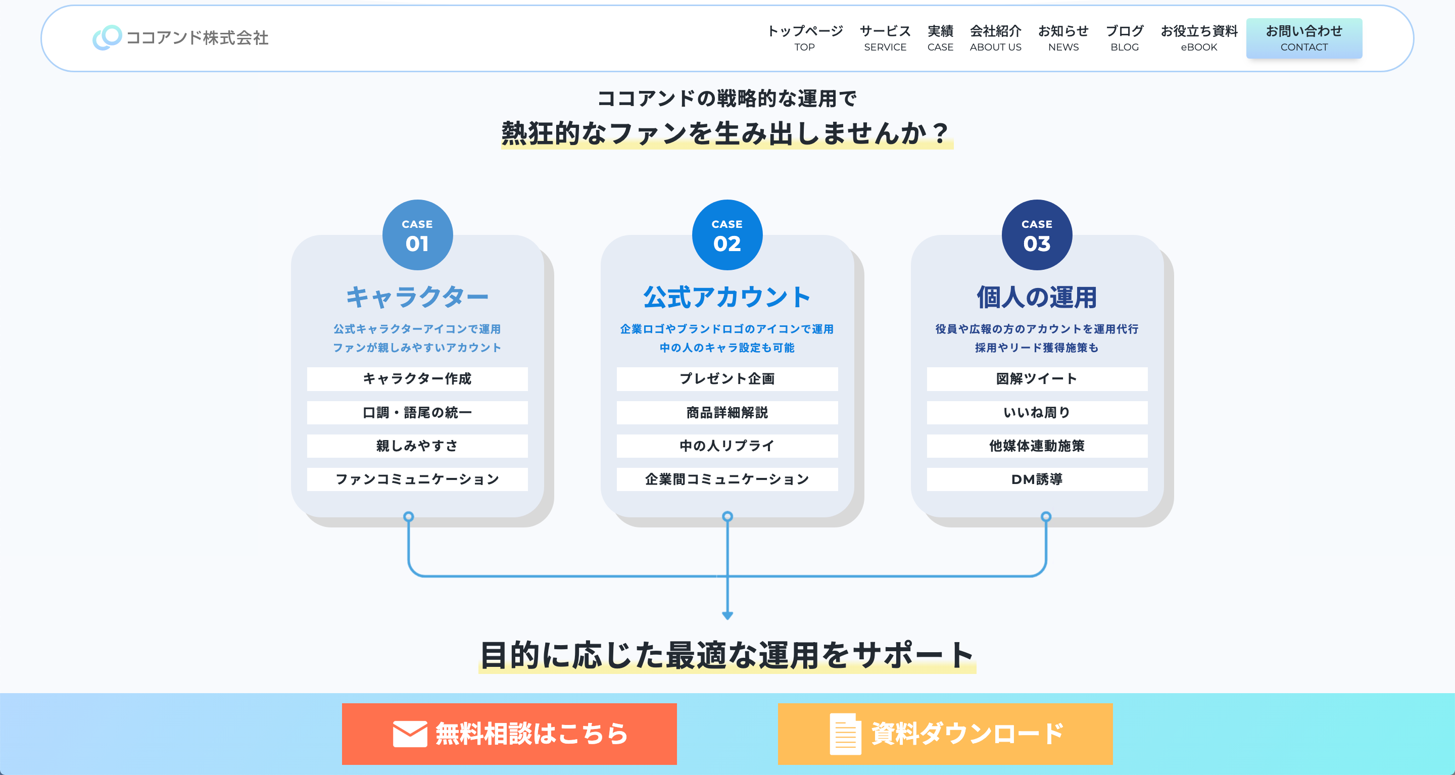 新たなサービスサイトでは、「なぜココアンドが選ばれるのか?」について様々な角度からお伝えできるような構成にしております。ココアンドの運用支援サービスの詳細や、運用手法の図解などを通じて、企業の皆様が理解しやすいサイトを目指しました。
