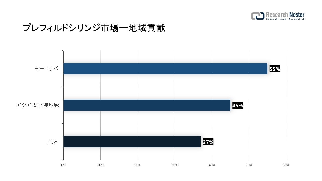 ヨーロッパのプレフィルドシリンジ市場シェアは、他のすべての地域の市場の中で最大であり、2033 年末までに約 41% になると予測されています。市場の成長は、主に高齢者人口の増加に起因する可能性があります。 高齢者人口の増加に伴い、この地域では、薬剤を投与するための充填済み注射器の使用など、医療サービスの需要が高まると予測されています。 たとえば、プレフィルドシリンジには、従来のバイアルやシリンジの取り扱いが難しい高齢の患者にとって重要な使いやすさなど、多くの利点があります。また、この地域の高齢者人口が増加し続けているため、予防接種や生物製剤など、充填済みの注射器で頻繁に投与される医薬品の需要はおそらく増加するでしょう。さらに、この地域での自己注射装置の採用の増加は、生物製剤およびバイオシミラー市場の拡大とともに、この地域の市場成長にも貢献すると予想されます。